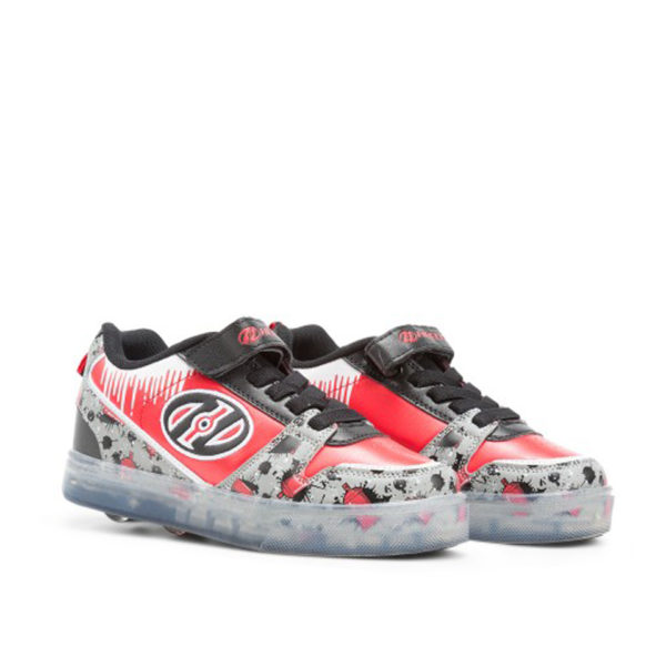Tenis Patin Heelys elaborado en material sintético, de la linea Boom X2 cuenta con un super estampado en color rojo, con la punta redonda, cuenta con velcro en la parte del empeine, lo mejor es que la suela es antiderrapante, que tiene luz led en la parte de la suela, que al caminar se activa por segundos.